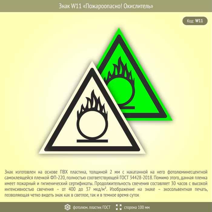 Знак W11 «Пожароопасно! Окислитель» (фотолюминесцентный пластик ГОСТ 34428-2018, сторона 100 мм) в Ульяновске купить