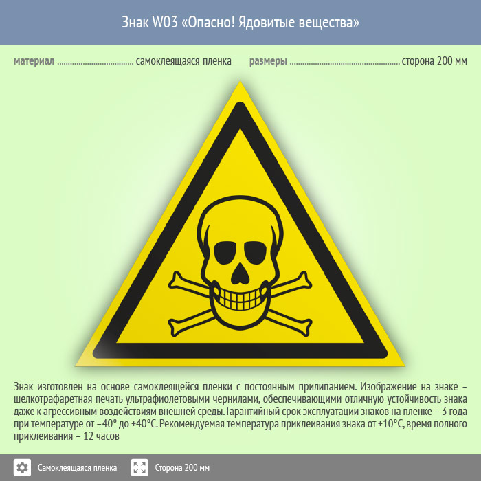Знак W03 «Опасно! ядовитые вещества» (пленка, сторона 200 мм) в Ульяновске купить