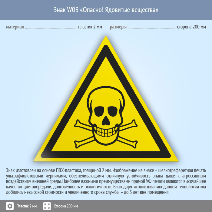 Знак W03 «Опасно! ядовитые вещества» (пластик, сторона 200 мм) в Ульяновске купить