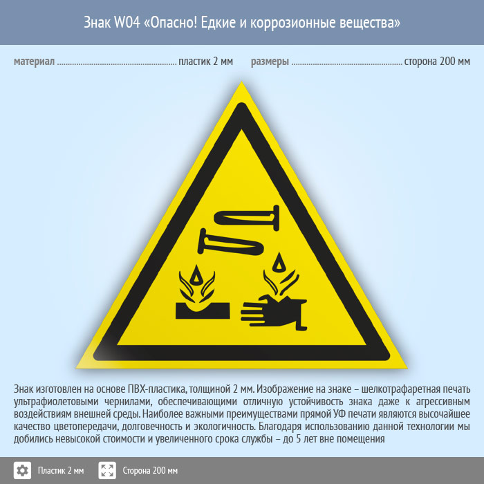 Знак W04 «Опасно! едкие и коррозионные вещества» (пластик, сторона 200 мм) в Ульяновске купить