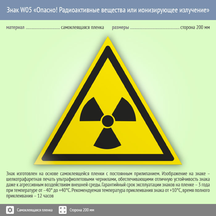 Знак W05 «Опасно! радиоактивные вещества или ионизирующее излучение» (пленка, сторона 200 мм) в Ульяновске купить