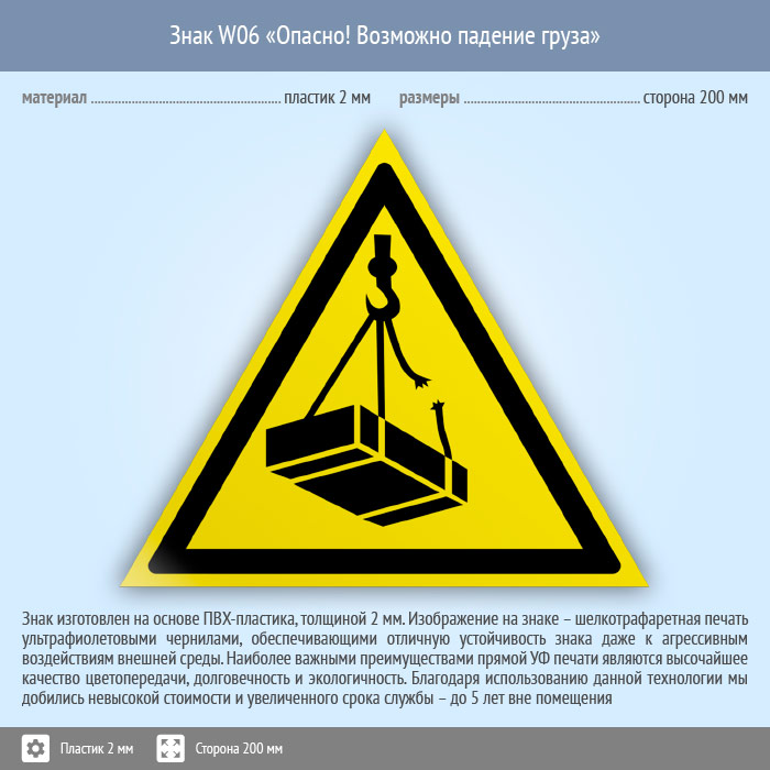 Знак W06 «Опасно! возможно падение груза» (пластик, сторона 200 мм) в Ульяновске купить