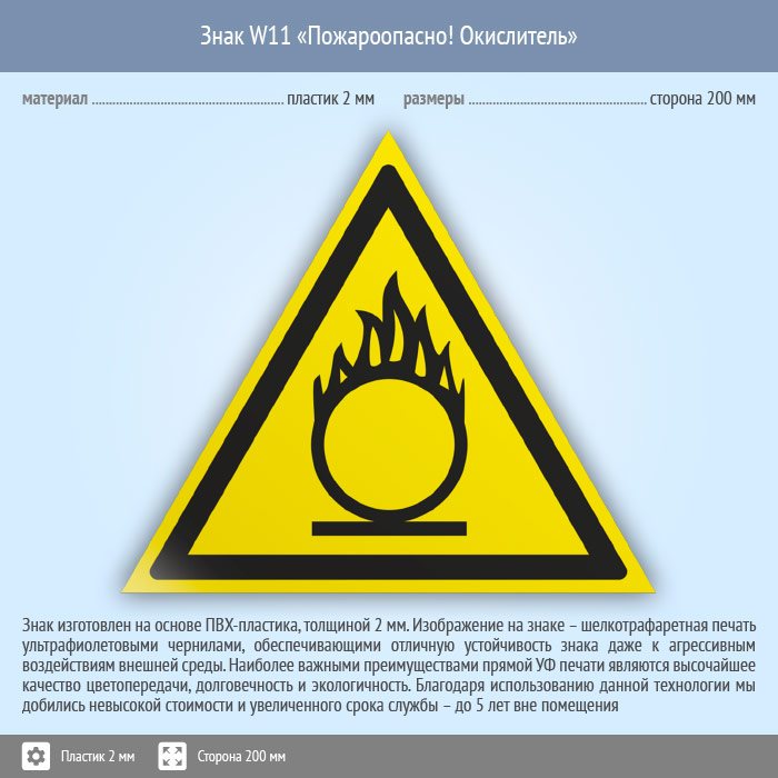 Знак W11 «Пожароопасно! окислитель» (пластик, сторона 200 мм) в Ульяновске купить