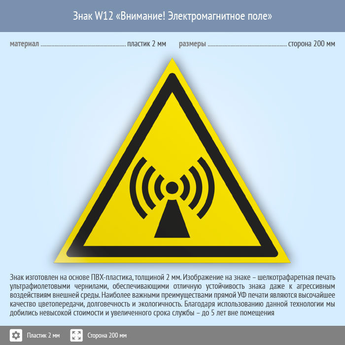 Знак W12 «Внимание! электромагнитное поле» (пластик, сторона 200 мм) в Ульяновске купить