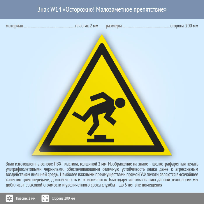 Знак W14 «Осторожно! малозаметное препятствие» (пластик, сторона 200 мм) в Ульяновске купить