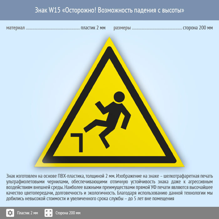 Знак W15 «Осторожно! возможность падения с высоты» (пластик, сторона 200 мм) в Ульяновске купить