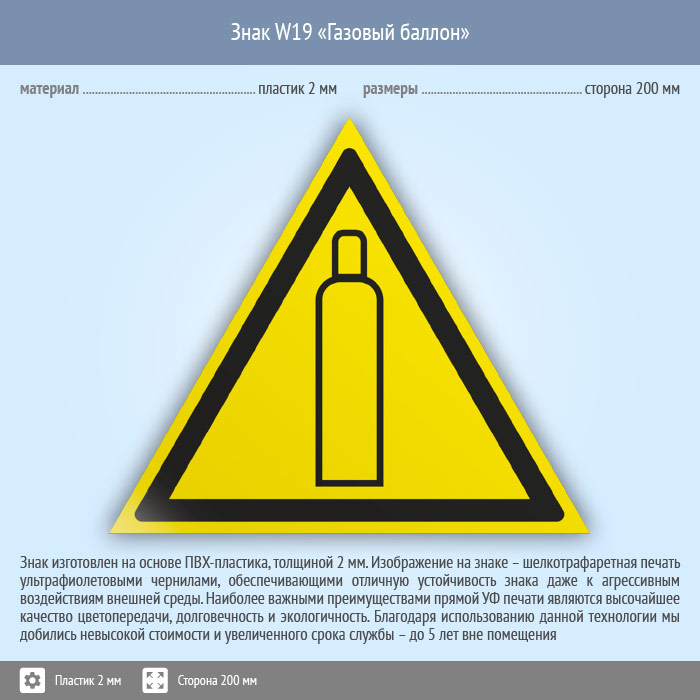Знак W19 «Газовый баллон» (пластик, сторона 200 мм) в Ульяновске купить
