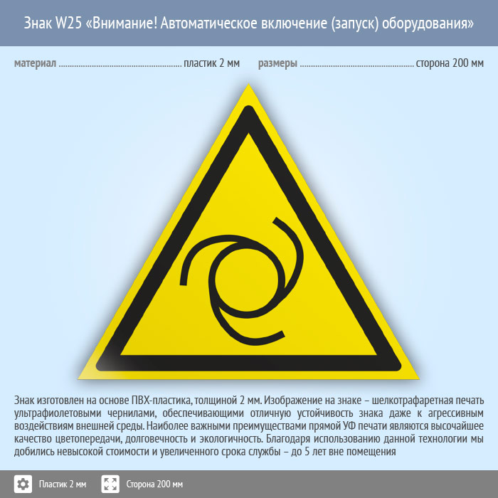 Знак W25 «Внимание! автоматическое включение (запуск) оборудования» (пластик, сторона 200 мм) в Ульяновске купить