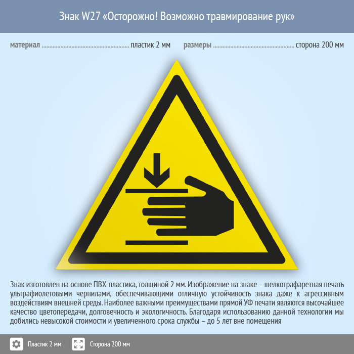 Знак W27 «Осторожно! возможно травмирование рук» (пластик, сторона 200 мм) в Ульяновске купить