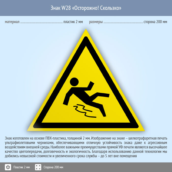 Знак W28 «Осторожно! скользко» (пластик, сторона 200 мм) в Ульяновске купить