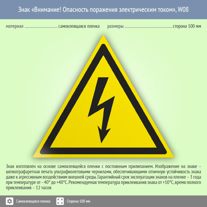 Знак W08 «Внимание! опасность поражения электрическим током» (пленка, сторона 100 мм) в Ульяновске купить
