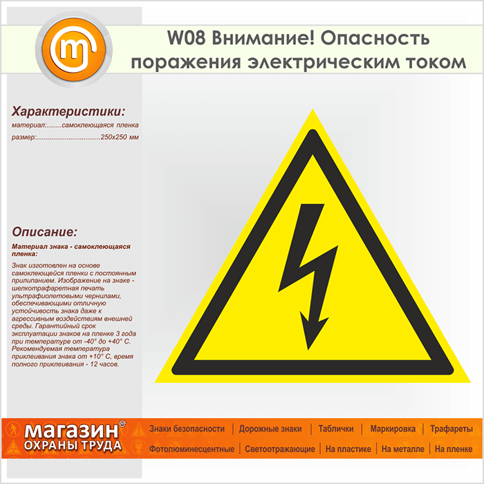 Знак W08 «Внимание! опасность поражения электрическим током» (пленка, сторона 250 мм) в Ульяновске купить