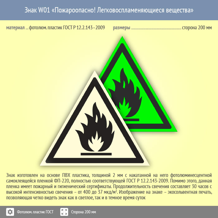 Знак W01 «Пожароопасно! Легковоспламеняющиеся вещества» (фотолюминесцентный пластик ГОСТ 34428-2018, сторона 200 мм) в Ульяновске купить