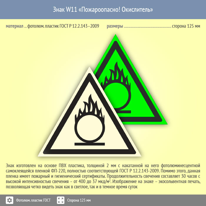 Знак W11 «Пожароопасно! Окислитель» (фотолюминесцентный пластик ГОСТ 34428-2018, сторона 125 мм) в Ульяновске купить