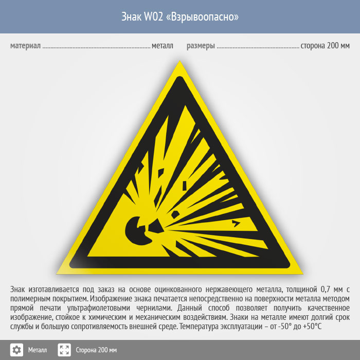 Знак W02 «Взрывоопасно» (металл, сторона 200 мм) в Ульяновске купить