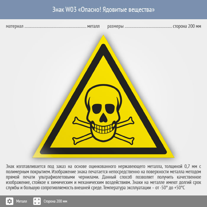 Знак W03 «Опасно! ядовитые вещества» (металл, сторона 200 мм) в Ульяновске купить