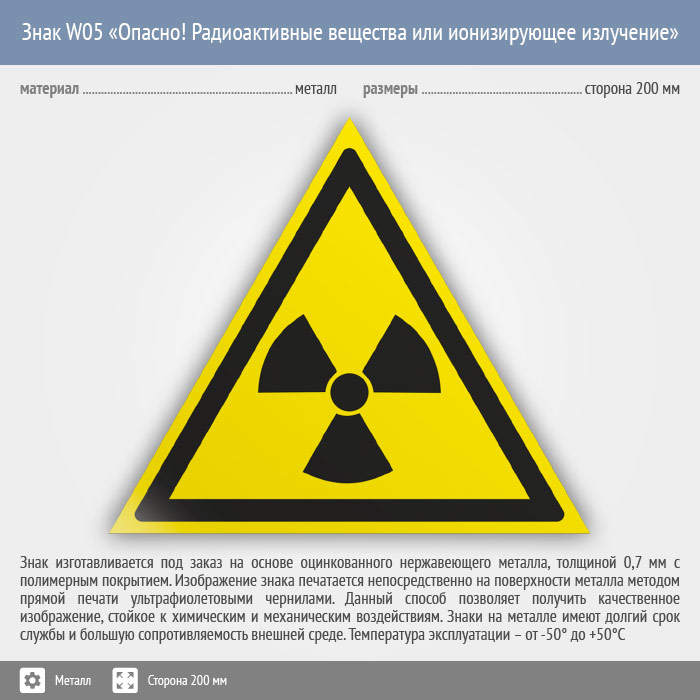 Знак W05 «Опасно! радиоактивные вещества или ионизирующее излучение» (металл, сторона 200 мм) в Ульяновске купить