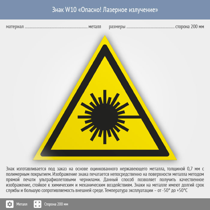 Знак W10 «Опасно! лазерное излучение» (металл, сторона 200 мм) в Ульяновске купить