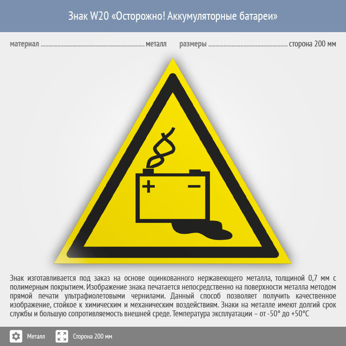Знак W20 «Осторожно! аккумуляторные батареи» (металл, сторона 200 мм) в Ульяновске купить