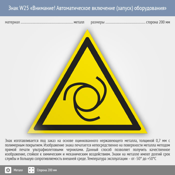 Знак W25 «Внимание! автоматическое включение (запуск) оборудования» (металл, сторона 200 мм) в Ульяновске купить