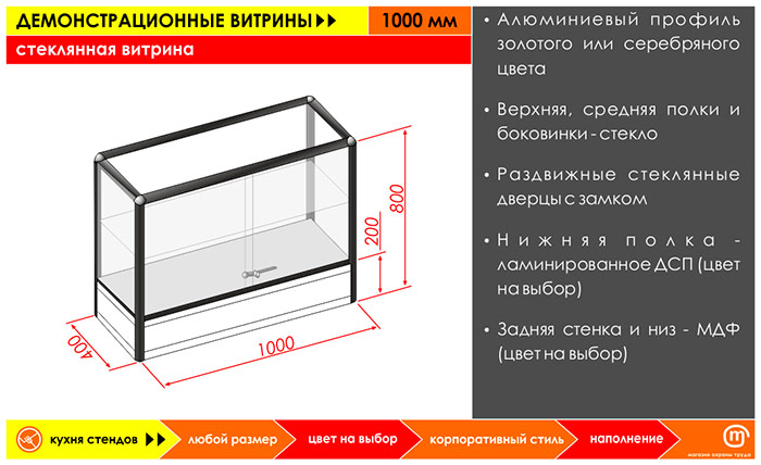 Предлагаем стеклянные витрины для демонстрации СИЗ различной ширины - 600, 1000 и 1200 мм. Высота всех витрин составляет 800 мм. Изготовливаются витрины из алюминиевого профиля золотого или серебряного цвета, верхняя, средняя полки и боковинки - стекло, раздвижные стеклянные дверцы с замком, нижняя полка изготавливается из ламинированного ДСП (цвет на выбор), задняя стенка и низ - из МДФ
