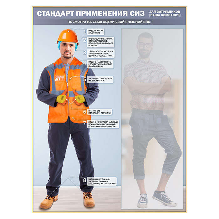К бесплатным изменениям относятся изменение названия, шрифта и цвета заголовков, изменение текста пунктов и их шрифта, замена фона на однотонный или градиентный, а также размещение фирменного логотипа. Если же на стенде нужно использовать другого персонажа с другим комплектом спецодежды - то цена увеличивается на 4'900₽ за макет