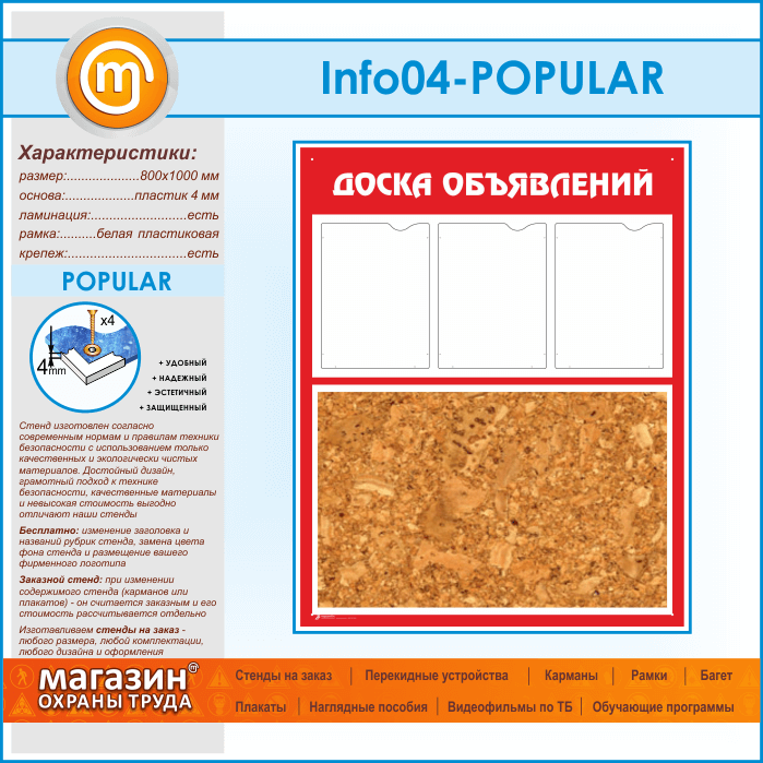 Стенд «Доска объявлений» с пробковым полотном и 3 карманами А4 формата (IN-04-POPULAR)