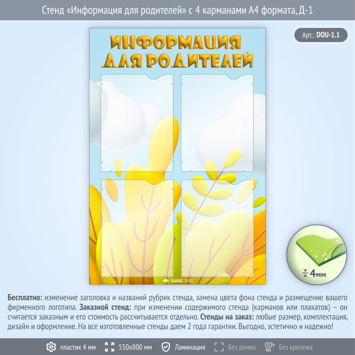 Стенд «Информация для родителей» с 4 карманами А4 формата (DOU-1.1) в Ульяновске купить