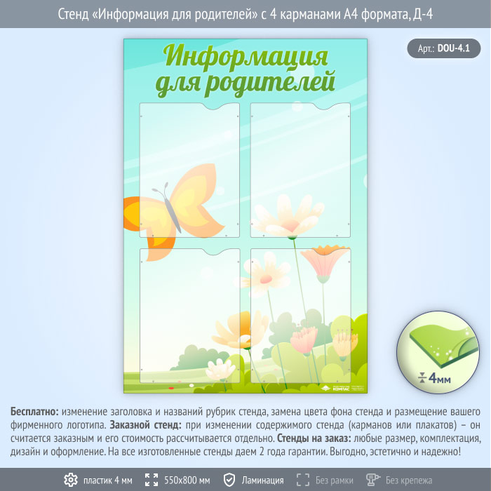 Стенд «Информация для родителей» с 4 карманами А4 формата (DOU-4.1) в Ульяновске купить