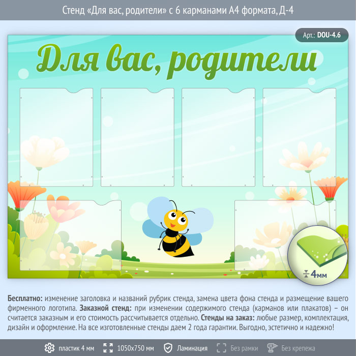 Стенд «Для вас, родители» с 6 карманами А4 формата (DOU-4.6) в Ульяновске купить