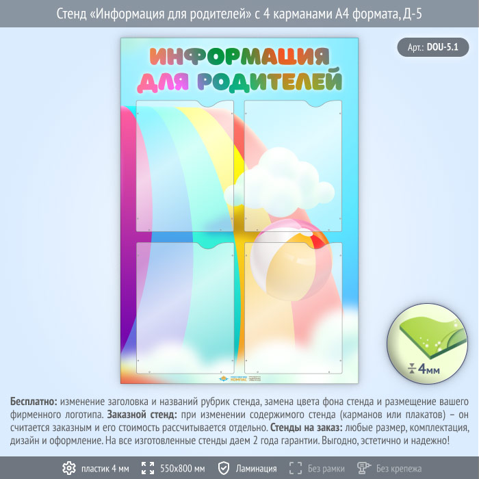Стенд «Информация для родителей» с 4 карманами А4 формата (DOU-5.1) в Ульяновске купить
