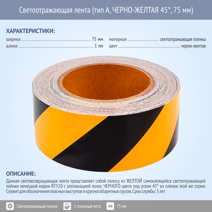 Светоотражающая сигнальная лента (тип А, ЧЕРНО-ЖЕЛТАЯ 45°, 75 мм х 1 п.м.) в Ульяновске купить