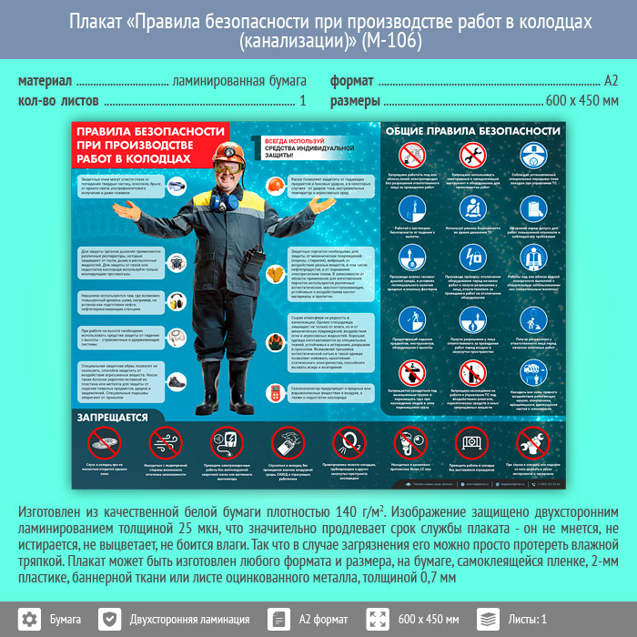 Плакат «Правила безопасности при производстве работ в колодцах (канализации)» (М-106, ламинированная бумага, А2, 1 лист) в Ульяновске купить