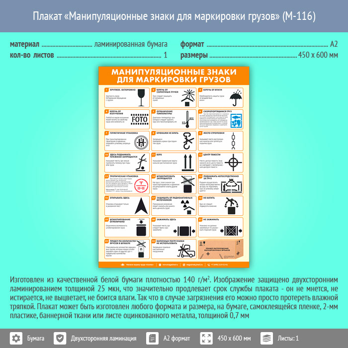 Плакат «Манипуляционные знаки для маркировки грузов» (М-116, ламинированная бумага, А2, 1 лист) в Ульяновске купить