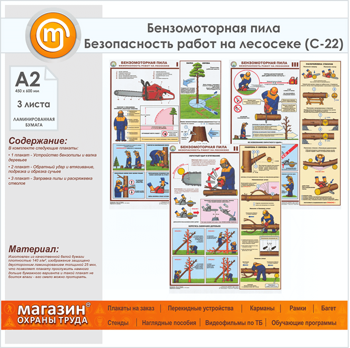 Плакаты «Бензомоторная пила. Безопасность работ на лесосеке» (С-22, ламинированная бумага, А2, 3 листа) в Ульяновске купить