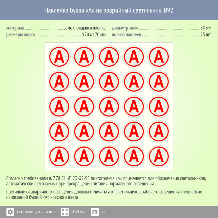 Наклейка буква «А» на аварийный светильник, B92 (пленка, диаметр 30 мм, блок 25 штук, 170х170 мм) в Ульяновске купить