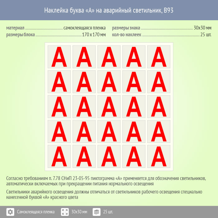 Наклейка буква «А» на аварийный светильник, B93 (пленка, 30х30 мм, блок 25 штук, 170х170 мм) в Ульяновске купить