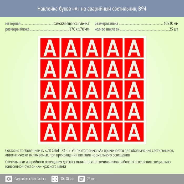 Наклейка буква «А» на аварийный светильник, B94 (пленка, 30х30 мм, блок 25 штук, 170х170 мм) в Ульяновске купить