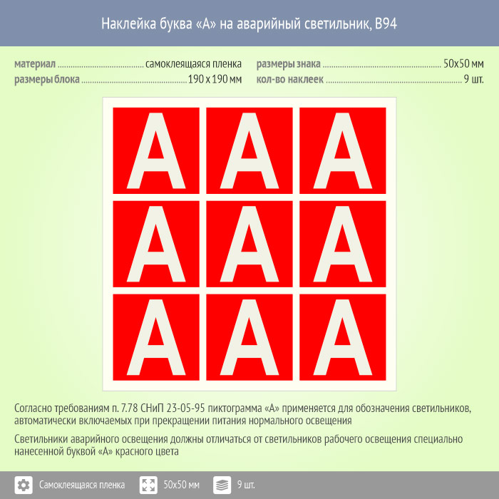 Наклейка буква «А» на аварийный светильник, B94 (пленка, 50х50 мм, блок 9 штук, 190х190 мм) в Ульяновске купить