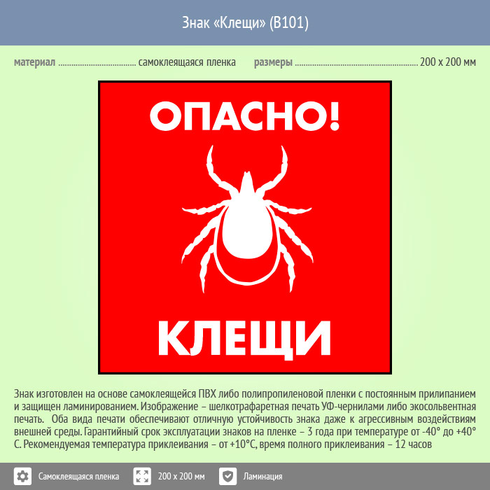 Знак «Опасно! Клещи», B101 (пленка c ламинированием, 200х200 мм) в Ульяновске купить