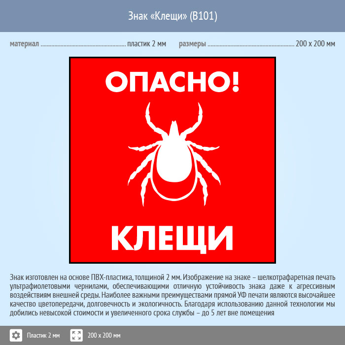 Знак «Опасно! Клещи», B101 (пластик, 200х200 мм) в Ульяновске купить