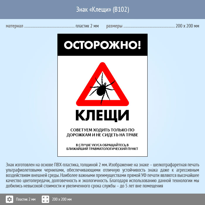 Знак «Осторожно! Клещи», B102 (пластик, 400х600 мм) в Ульяновске купить