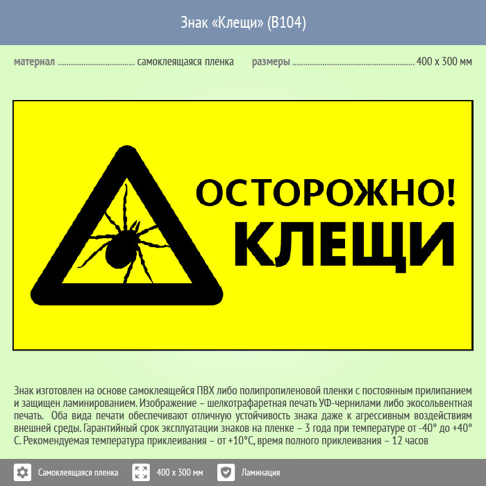 Знак «Осторожно! Клещи», B104 (пленка c ламинированием, 300х200 мм) в Ульяновске купить