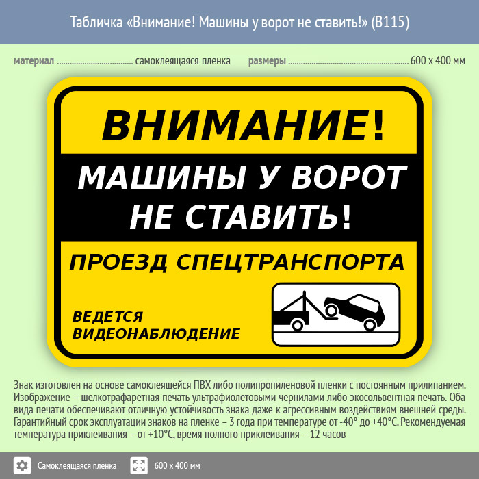 Табличка «Внимание! Машины у ворот не ставить!», B115 (пленка, 600х400 мм) в Ульяновске купить