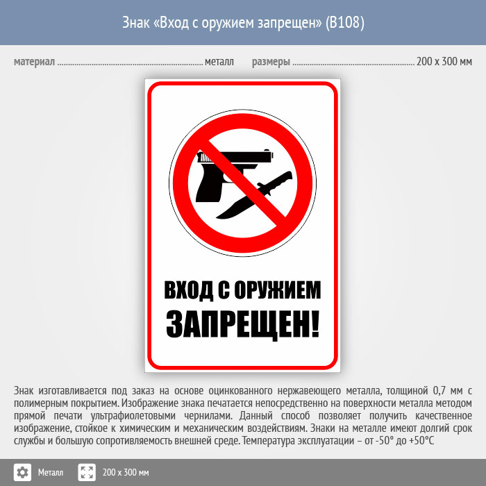Знак «Вход с оружием запрещен», B108 (металл, 200х300 мм) в Ульяновске купить