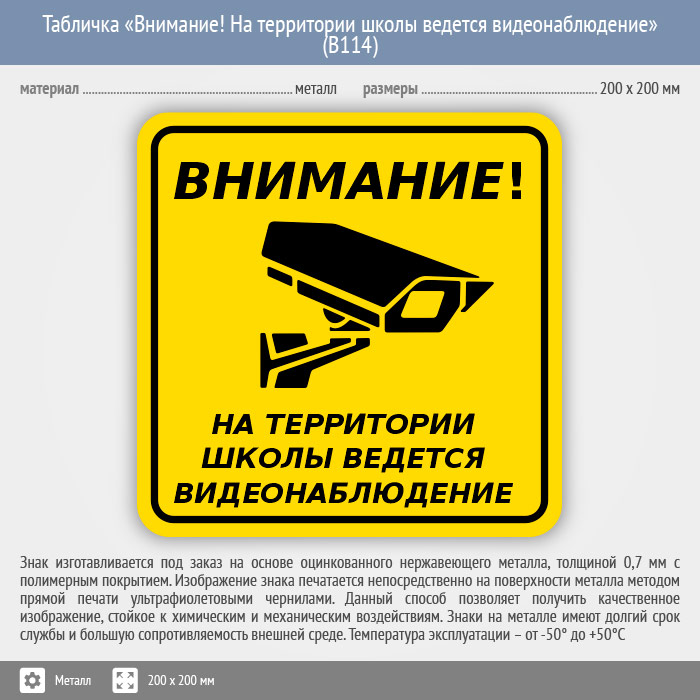 Табличка «Внимание! На территории школы ведется видеонаблюдение», B114 (металл, 200х200 мм) в Ульяновске купить