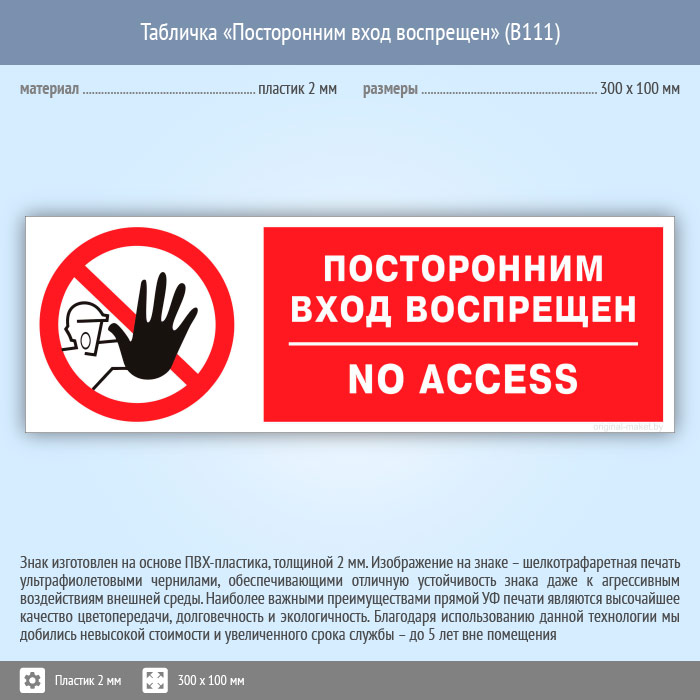 Табличка «Посторонним вход воспрещен», B111 (пластик, 300х100 мм) в Ульяновске купить