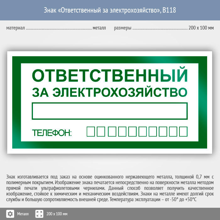 Знак «Ответственный за электрохозяйство», B118 (металл, 200х100 мм) в Ульяновске купить