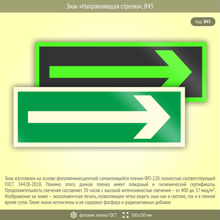 Знак «Направляющая стрелка», B45 (фотолюминесцентная пленка ГОСТ 34428-2018, 300х100 мм) в Ульяновске купить