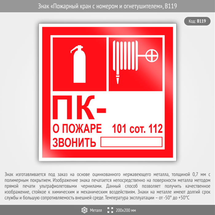 Знак «Пожарный кран с номером и огнетушителем», B119 (металл, 200х200 мм) в Ульяновске купить